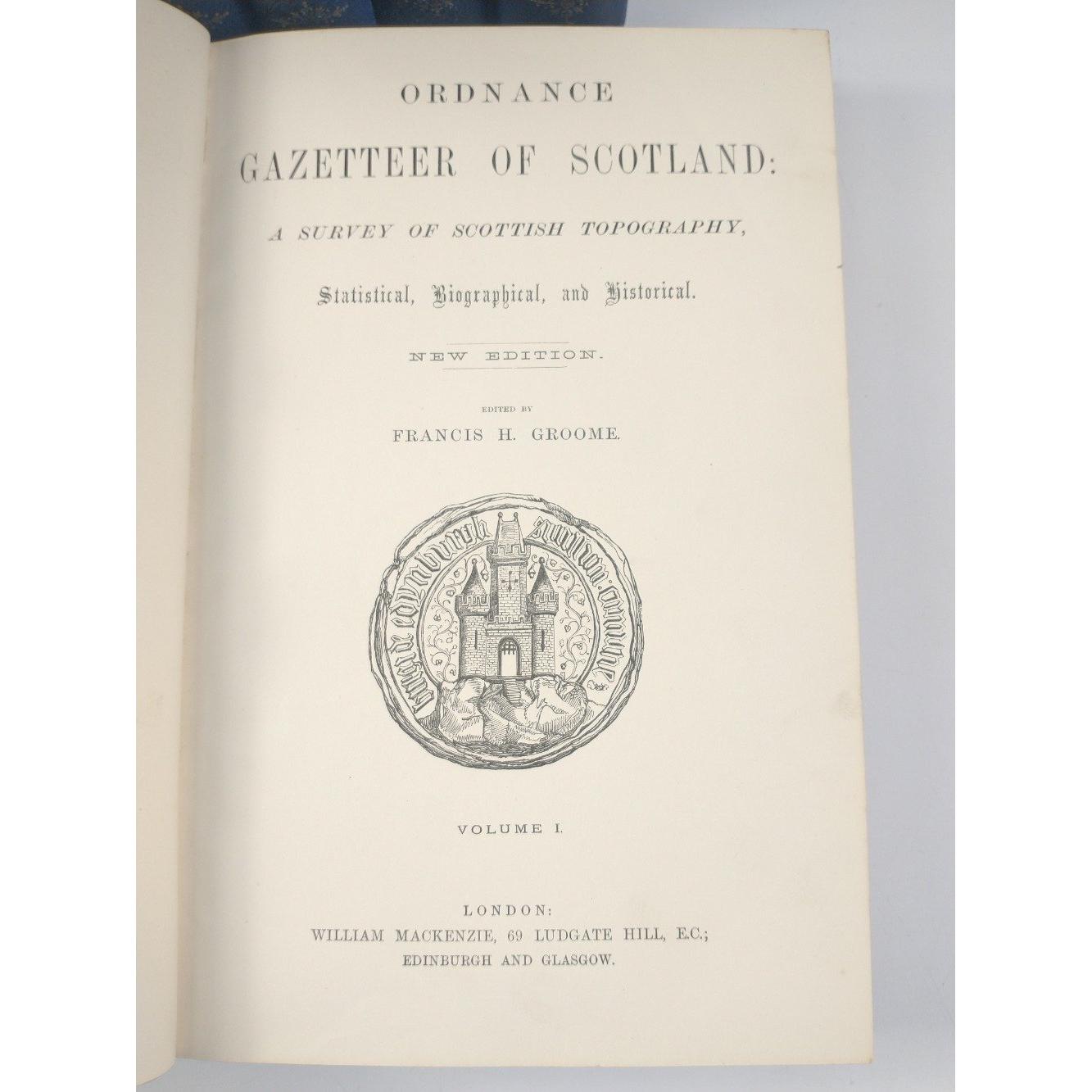 Six volumes of the Ordnance GAZETTEER of SCOTLAND in blue bindings. Published by William McKenzie. In good order complete with plates and fold out maps. Approx 6 pieces