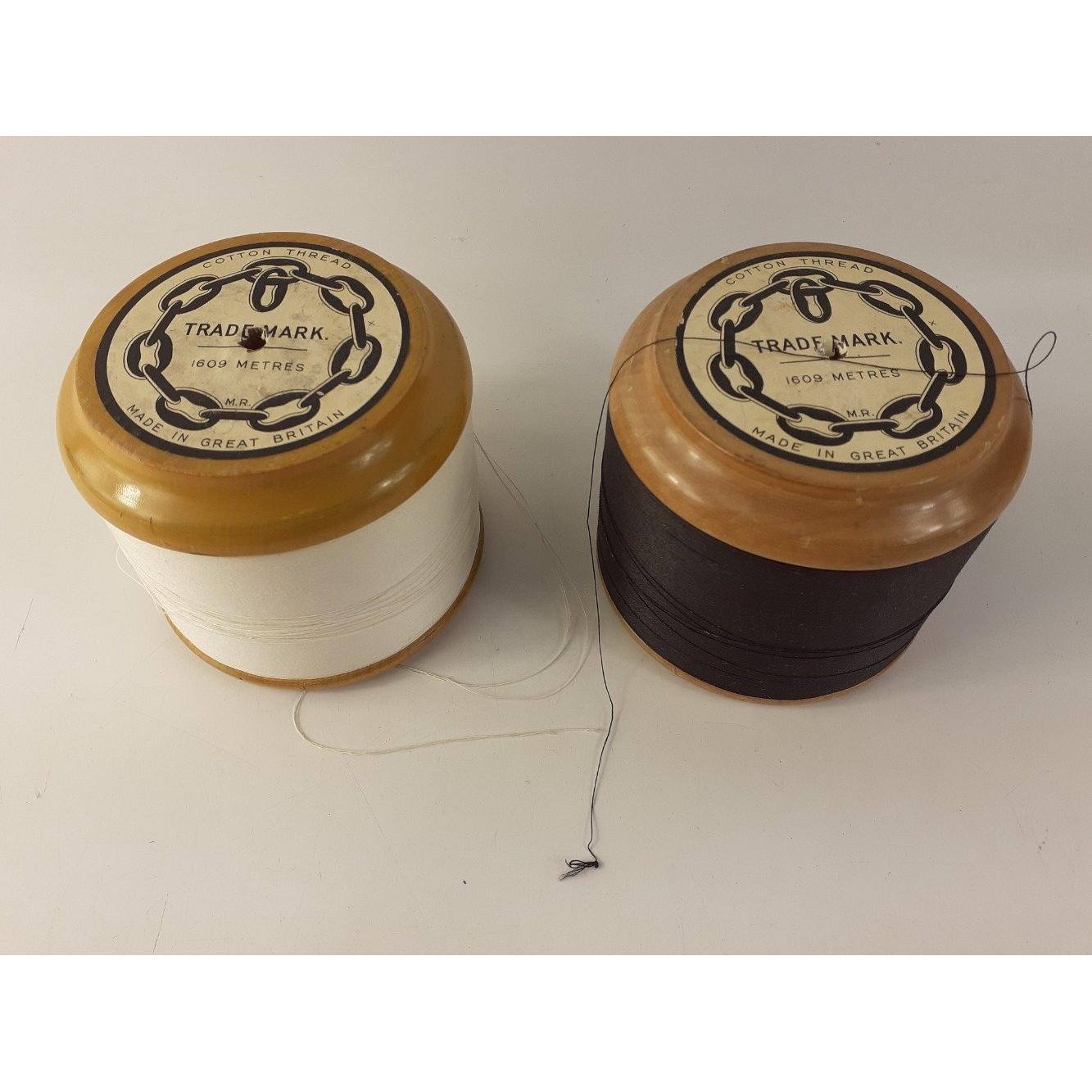 Rare to find - two J&P Coats one mile bobbins with white and black 6 cord threadApprox 2 pieces