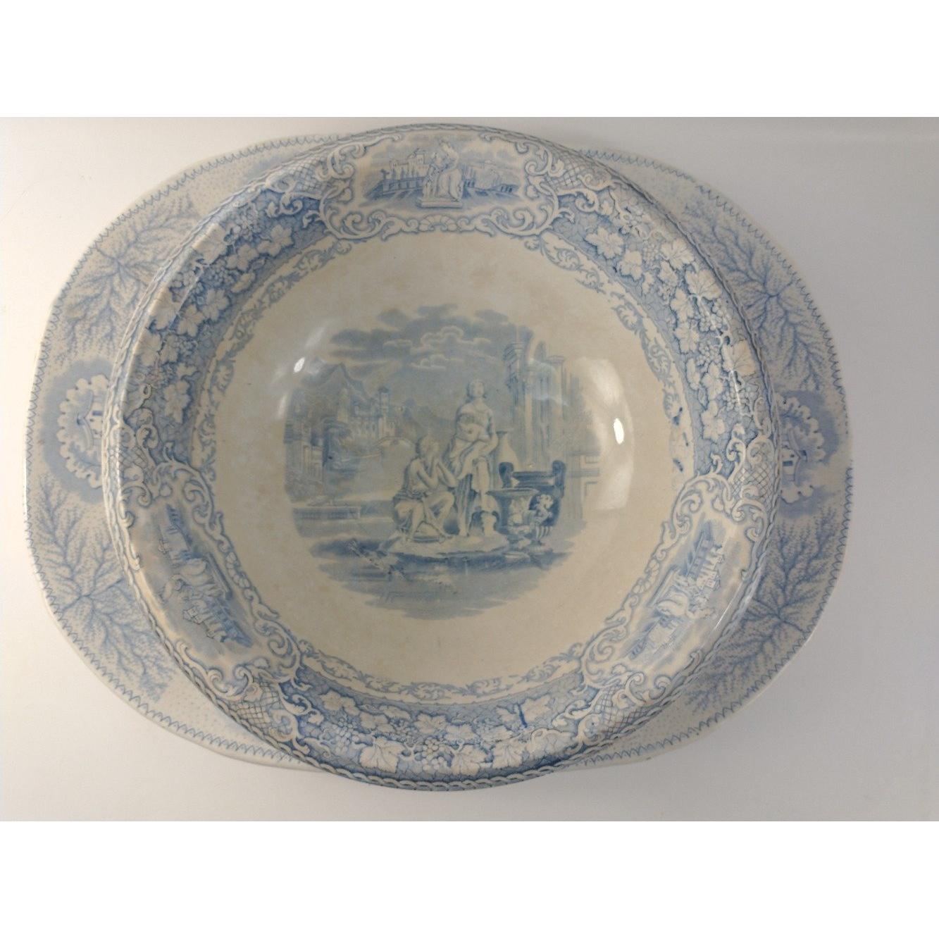 A large METHVEN & SONS Verona pottery basin with classical blue and white design 36cm dia x 13cm high with an exceptionally large salver (no maker's mark) with Oriental design 52cm x42cm. A few small chips on the under lip of the bowl do not detract from this aged item.