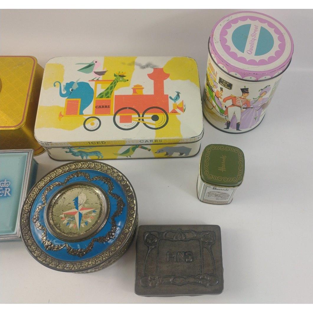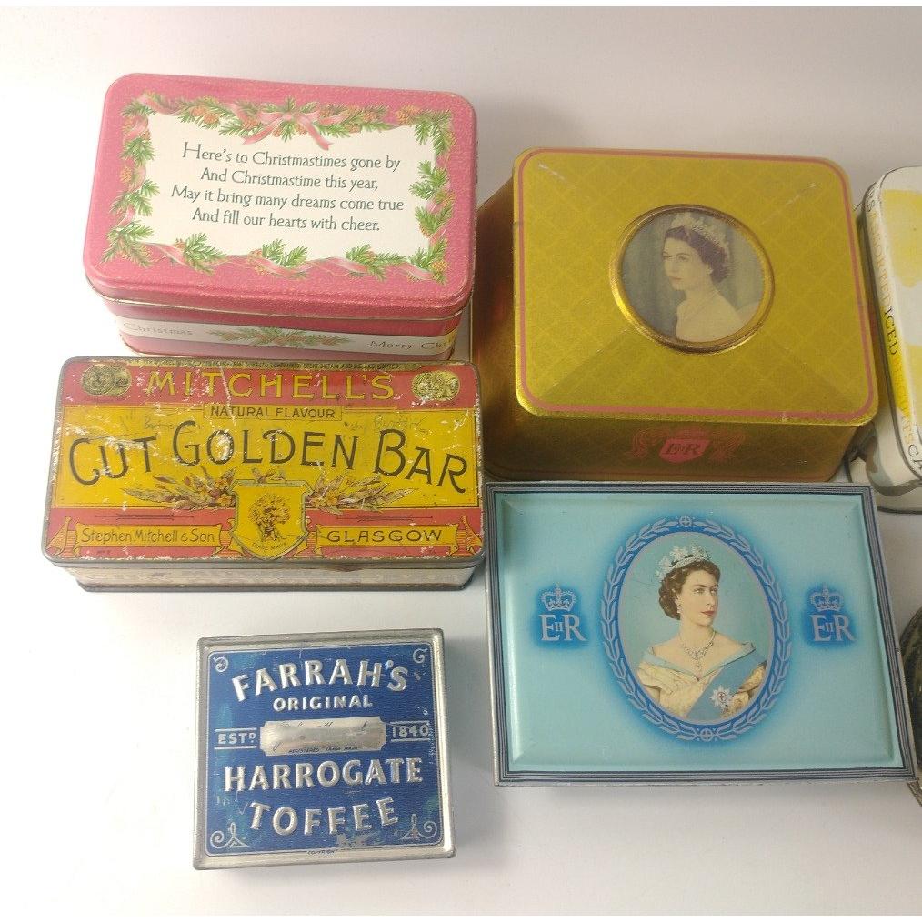 A collection of vintage collectable tins to include 1960s/70s CARRS ASSORTED ICED BISCUITS, MITCHELL'S CUT GOLDEN BAR tobacco, FARRAH'S ORIGINAL HARROGATE TOFFEE, MACKINTOSH QUALITY STREET, plus royal commemorative etc