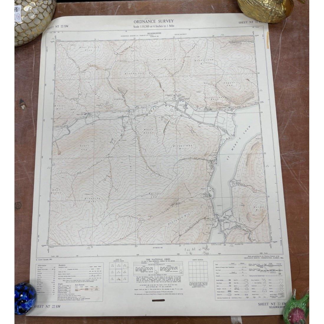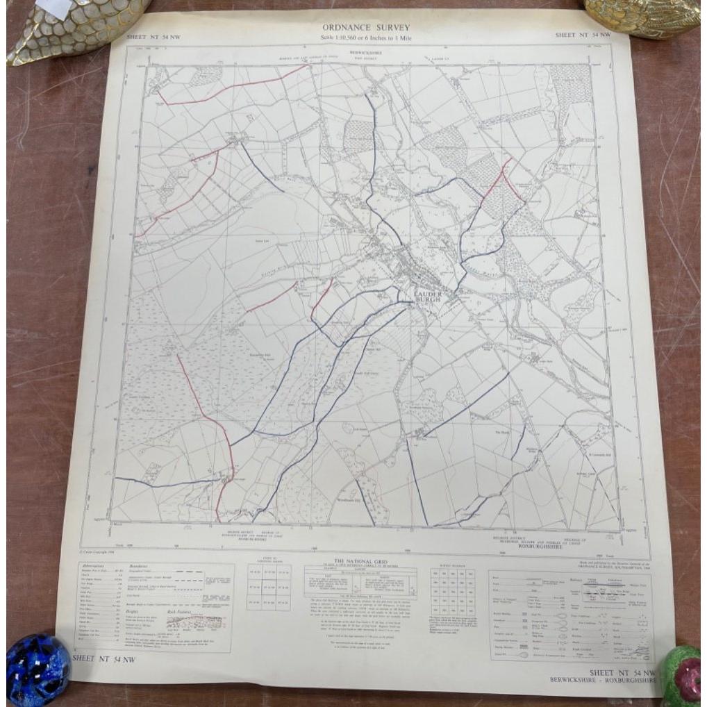 with also OS map showing Berwickshire Lauder Burgh sheet NT 54 NW with also OS Selkirkshire sheet NT 22 SW - in good condition overall with no obvious tears etc -dimensions approx 22" x 27" approx