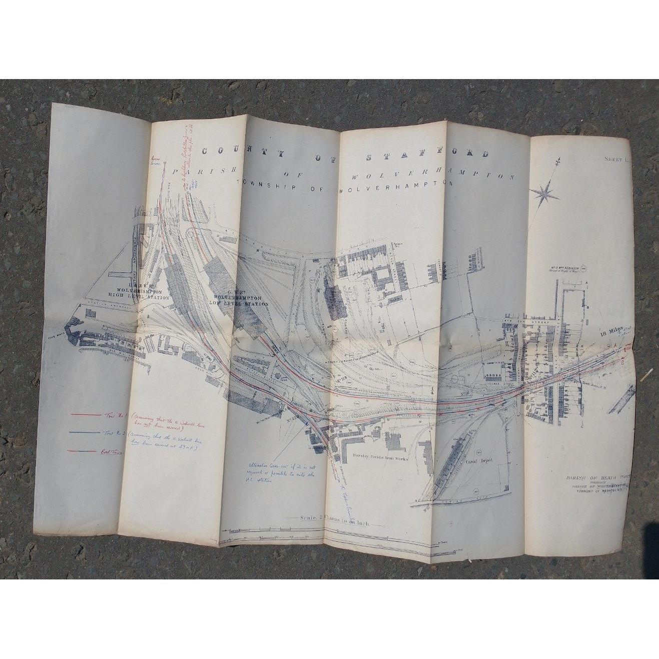 A great opportunity for RAILWAY TRACK/TRAIN ENTHUSIASTS! A lot of 8 railway track maps from areas such as Bushbury (approx. 47cm x 77cm), Wolverhampton (approx. 52cm x 77cm), Hampton in Arden (approx. 40cm x 77cm), Water Orton East (approx. 49cm x 75cm), Water Orton West (approx. 49cm x 74cm), Birmingham New Street (approx. 46cm x 93cm), Whitacre (approx. 52cm x 77cm) and Walsall District (approx. 77cm x 131cm)..
