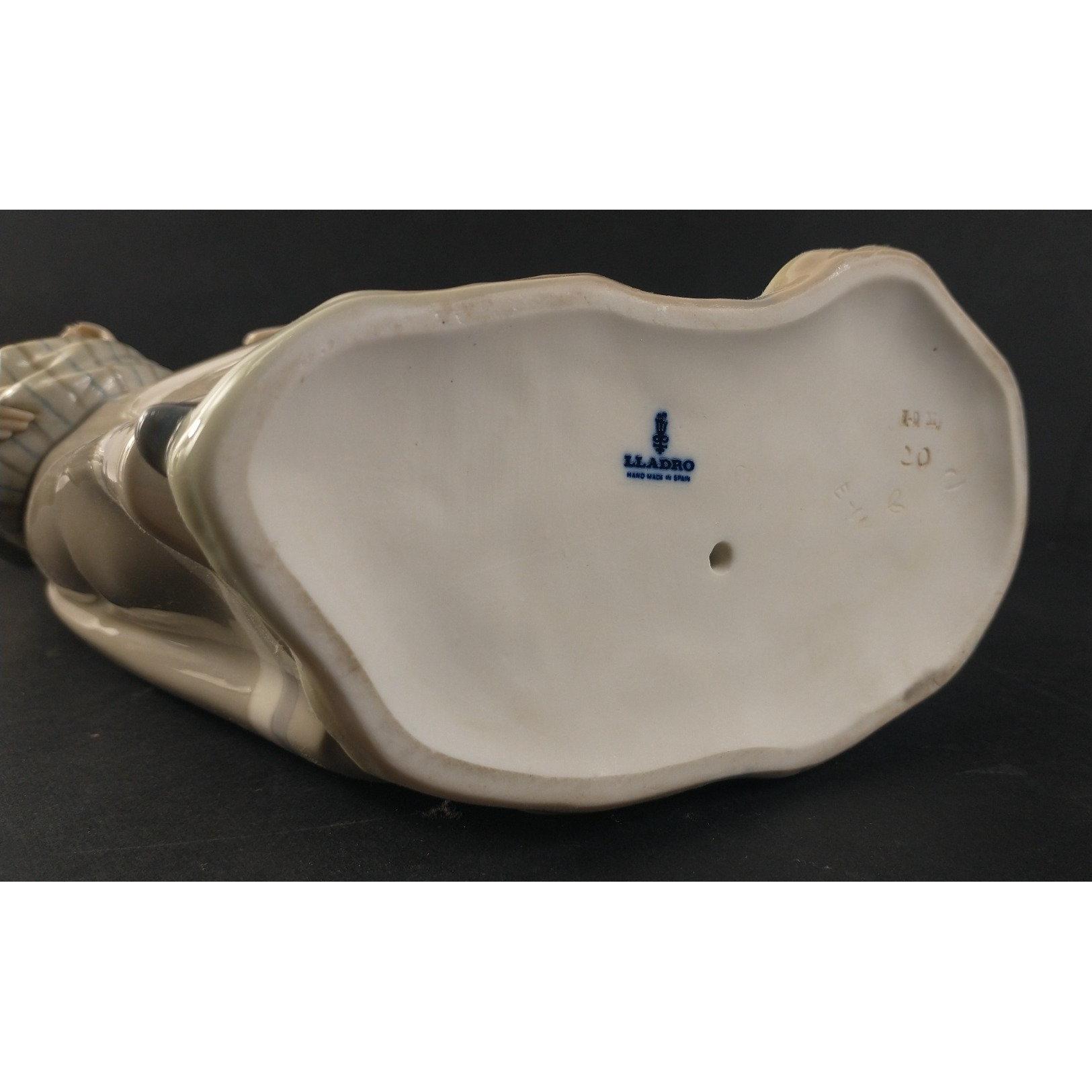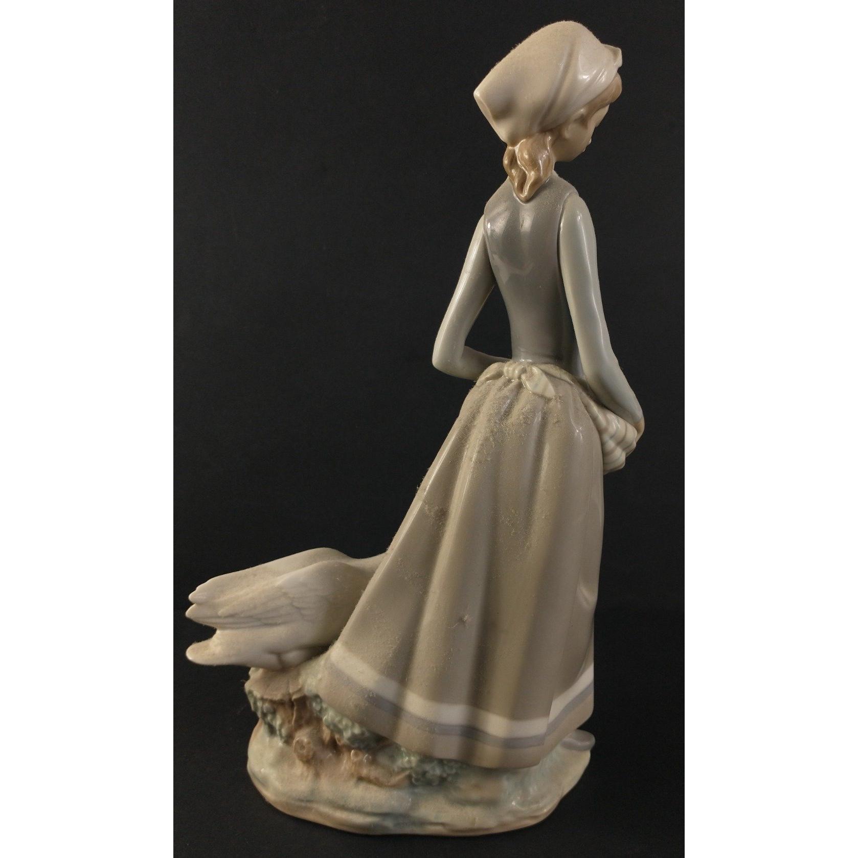 A LLADRO female figurine of a country girl nestling a gosling in her apron followed by a concerned mother goose. Handmade in delicate pastel colours. No.: J-9 M / 20 / E - 11. Slight damage to one index finger, otherwise in excellent condition. Approx. 31cm in height.