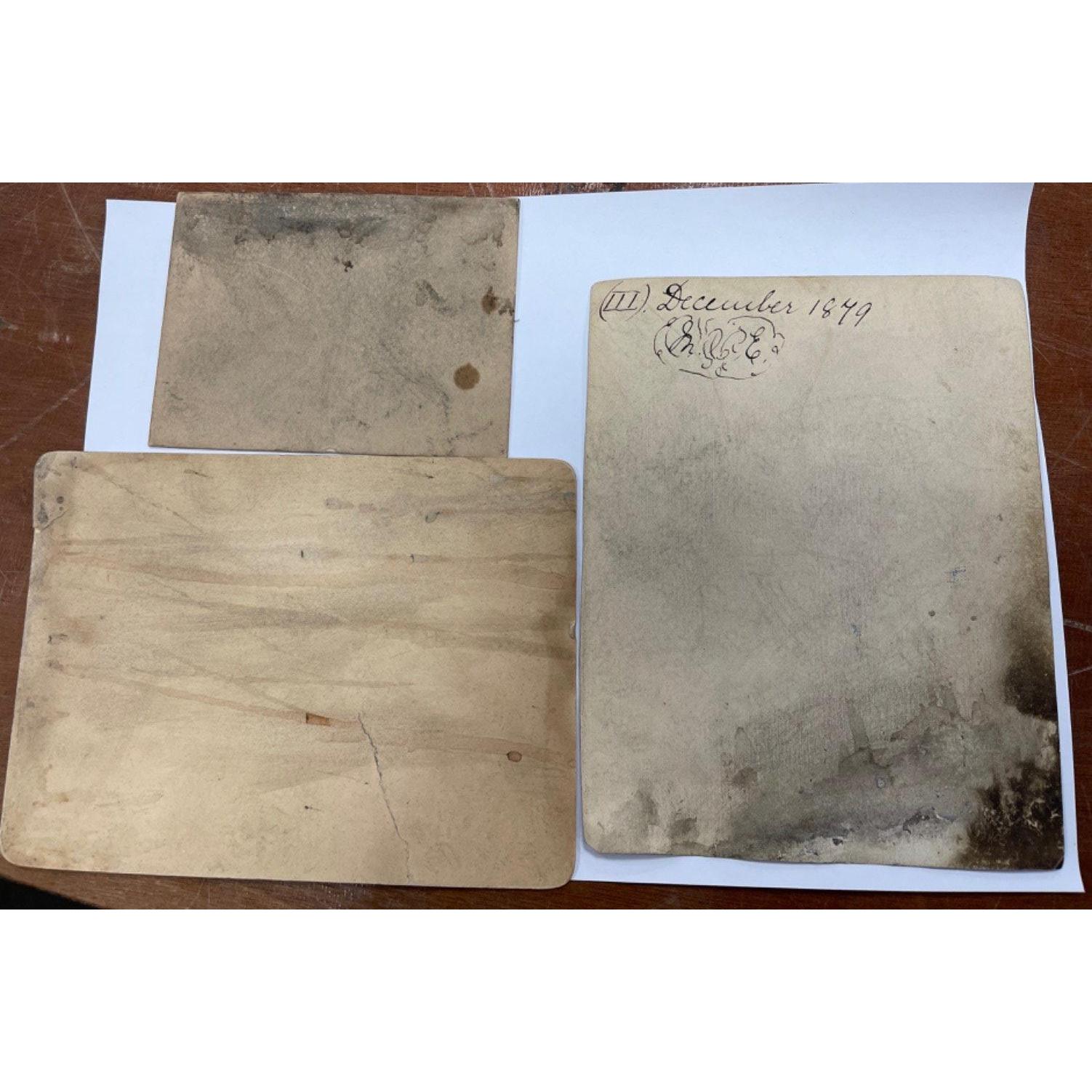 VINTAGE ARTWORK! to include two handpainted owls in top hats dimensions 17.5cm x 12.5cm, an 1879 handpainted yellow crocus (Christmas Dec 1879) 18cm x 14cm and a hand pencilled sketch of a moored sailing boat 12cm x 10cm approx