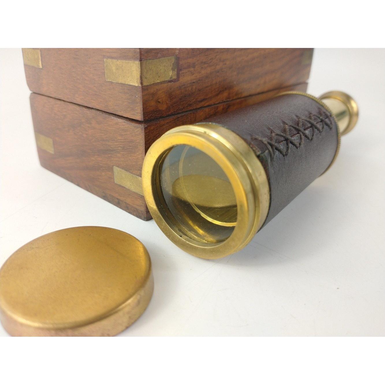 For LOVERS of THE SEA! A beautiful extendable brass telescope with wooden carved box inlaid with the anchor and rope symbol. In excellent condition. Telescope measures approx. 3.5cm in diameter and 9cm closed and 12.5cm extended.