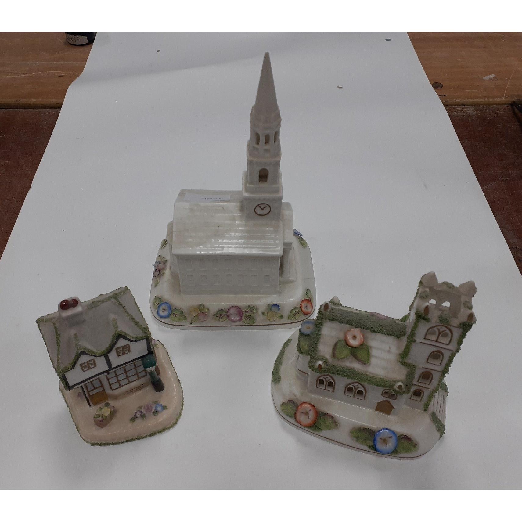 A set of 3 COALPORT fine bone china items to include "The American Church" approx. L14ckm x W11.5cm x H23cm. (Has damage / repairs). Together with "Village Church" approx. L13cm x W9cm x H14cm and "The Old Curiosity Shop" approx. L8cm x W9cm x H13cm.