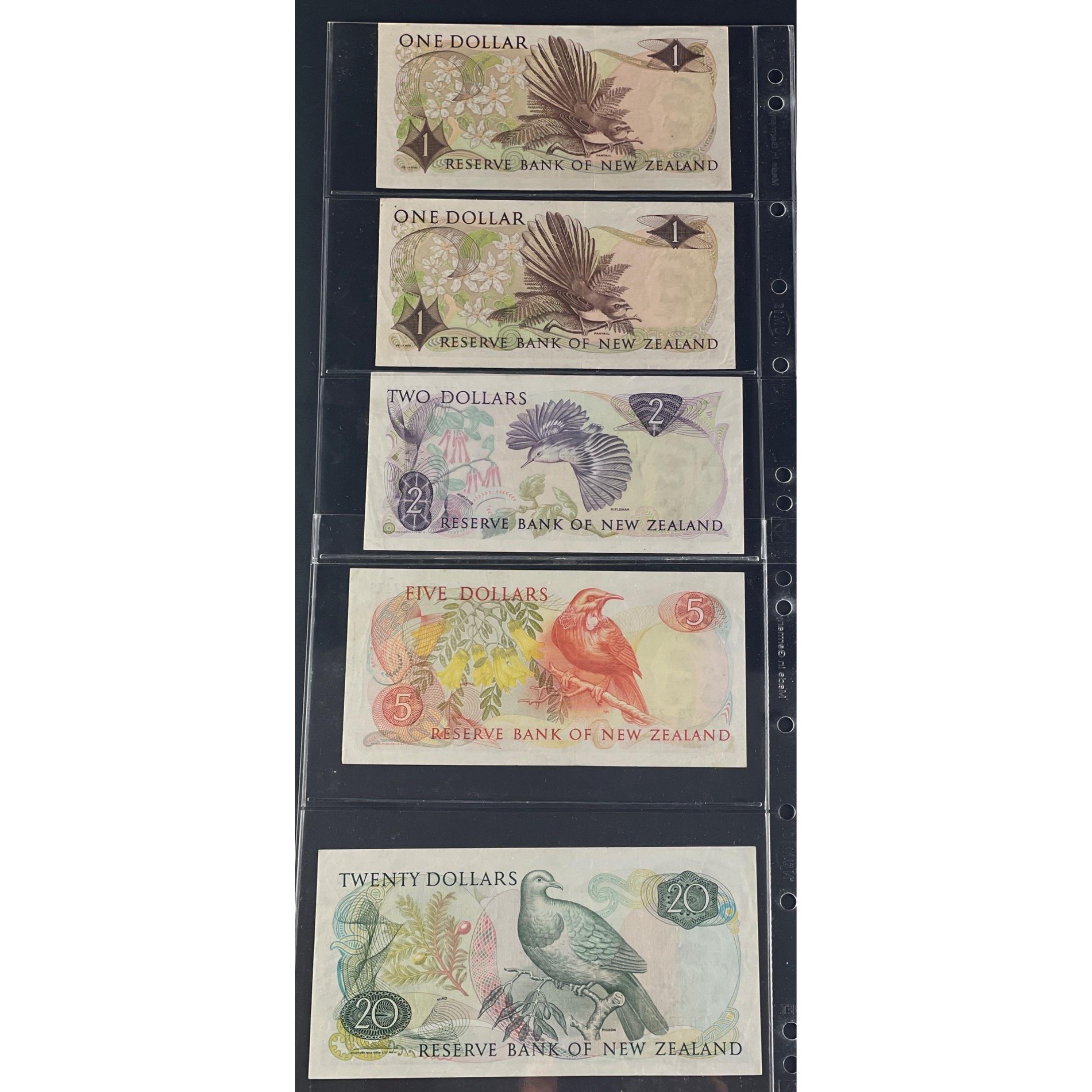 NEW ZEALAND Banknote collection to include two One Dollar notes, one Two Dollar note, one Five Dollar note and one Twenty Dollar note.