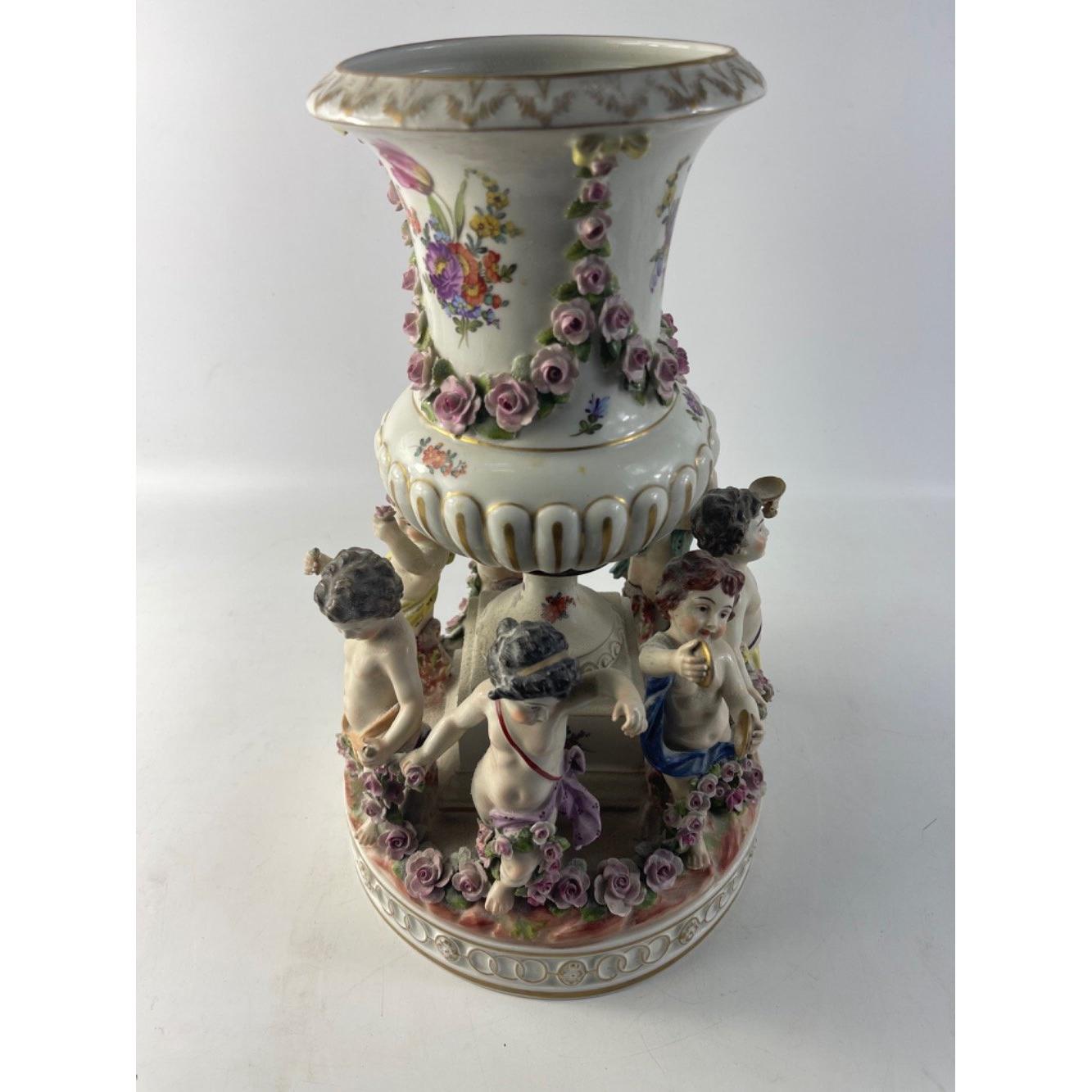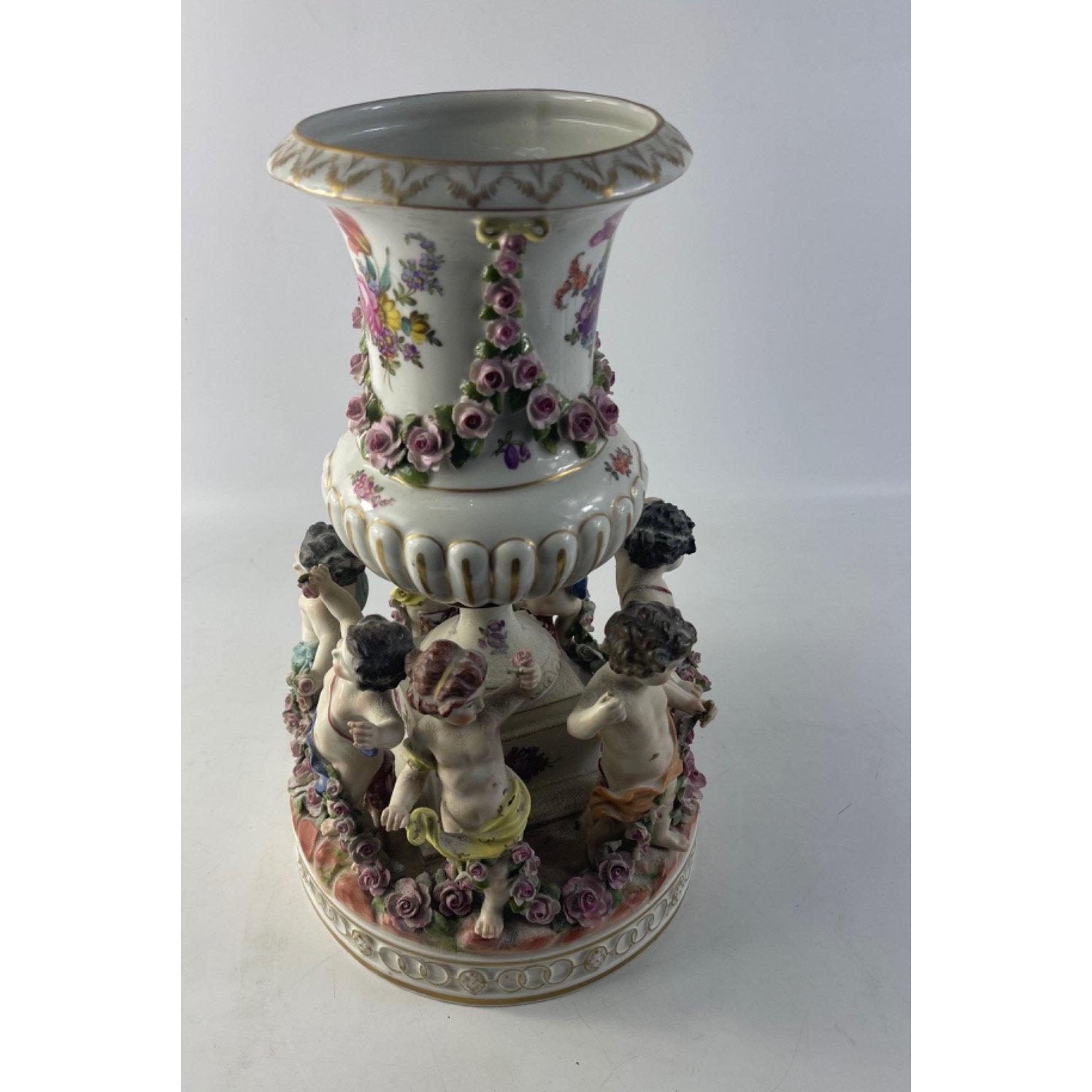 ANTIQUE c1870-90 GERMAN PORCELAIN - LUDWIGSBURG blue stamp to base large centrepiece stand with raised floral decorated urn with 8 eight children playing to base and decorated with floral garlands - no damage is noted to any missing fingers or flowers etc, however there is a historical crack on the base (see pic gallery)which is hardly noticeable, this item is in remarkable condition! - dimensions 37cm tall x 20cm wide approx